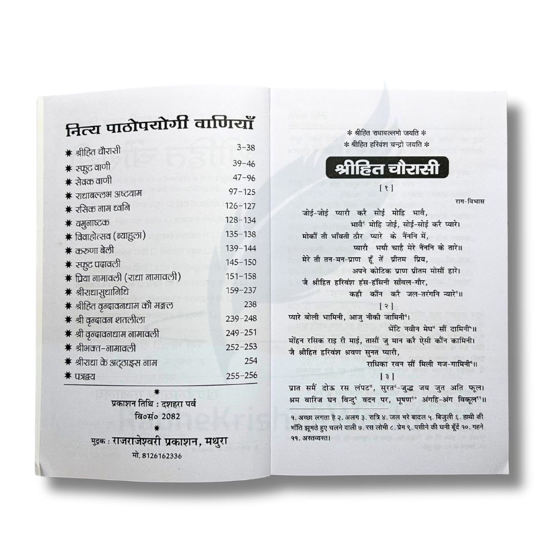 Not only does it describe Shri Radha Rani’s divine leelas, but it also reveals the Dharmik path shown by Shri Hit Harivansh Mahaprabhu Ji. Consequently, it helps readers understand the true meaning of love, service, and surrender in Bhakti. The verses connect the soul with Vrindavan’s pure Dharmik energy, allowing one to feel closer to the divine.